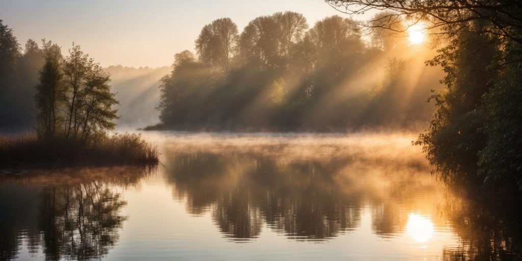 Misty Morning Sunrise Over a Tranquil Lake with Sun Rays and Reflections. Uploaded 08/10/2025 Isaiah 33:2 AI Generated. Misty Morning Sunrise Over a Tranquil Lake with Sun Rays and Reflections